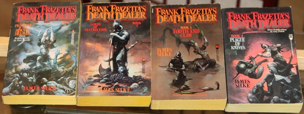 Fantasy (Black Gate): James Silke (1931 – ) is something of a renaissance man in the arts. He’s a visual artist and prose writer, a set and costume designer, photographer, and comic book guy. Most people who I meet recognize him as a comic artist/writer, although I’ve never read any of his graphic stuff. I’ve seen a few of the movies he’s worked on, including King Solomon’s Mines and The Barbarians. My only experience with Silke’s writing is the four Sword & Sorcery books in the Frank Frazetta Death Dealer series.